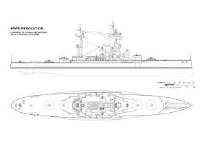 My first drawing is of Resolution and shows how she appeared in early 1942. The second drawing shows how she would have appeared if converted by simply replacing the main 14-inch armament with twin QF 4-inch XVI mounts in barbettes giving a total of 16. While 16 does not seem a huge improvement it is important to note that there is a separate HACS for each pair of mounts; one forward, one on each beam and one aft. There are two octuple pom-poms and two quads plus 20 x 20mm Oerlikons in single mounts. The 6-inch casemounts have been removed and plated over. Ballast would almost certainly have to be used to counter the loss of topweight although extra feedwater tanks would have overcome the inherent problem of the class.