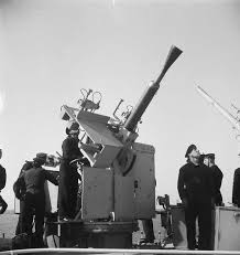 The 40mm Bofors – basically the Army’s Mark III LS [Land Service] hand-operated single mounts – that first found its way in Royal Navy use [some 500 of them eventually] were ones rescued from the Army during the evacuation from Norway in 1940. The first official installations – as distinct from simply being placed on their land-based mounting wherever there was room and a good firing arc offered – were aboard battleships Nelson, Prince of Wales, cruiser Manchester and monitor Erebus. The water-cooled twin versions [Marks IV and IV/I] were first fitted in November 1942 to the sloop Wimbrell.